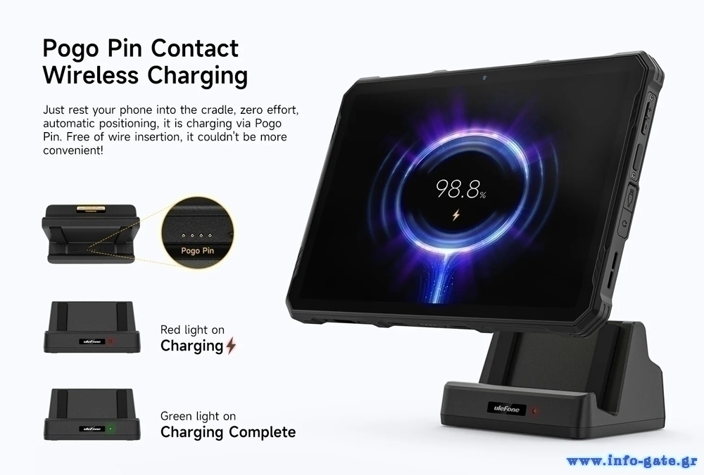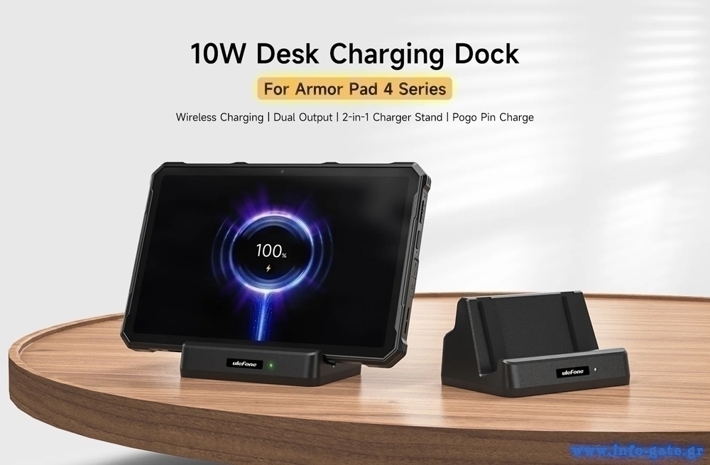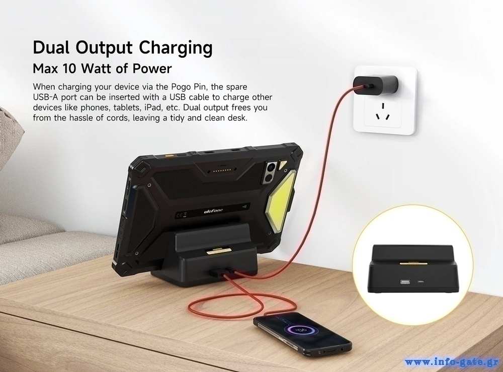 Επιτραπέζια βάση φόρτισης από την Ulefone, συμβατή με τα tablet της σειράς Armor Pad 4. Φορτίζει την συσκευή σας μέσω των επαφών Pogo Pin με μέγιστη απόδοση 10W. Επιπλέον, στο πίσω μέρος της διαθέτει έξοδο USB που σας επιτρέπει να φορτίζετε παράλληλα ακόμη μια συσκευή η όποια φορτίζει μέσω θύρας USB.