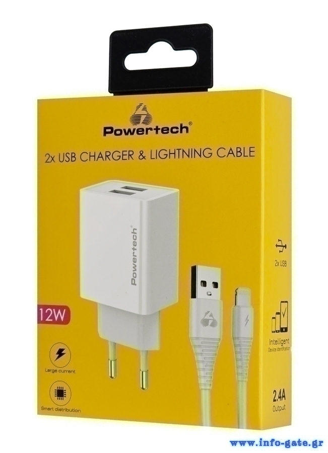 POWERTECH φορτιστής τοίχου PT-1325 με καλώδιο Lightning, 2x USB, 12W, λευκός