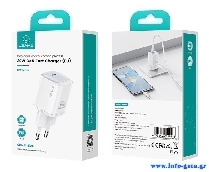 USAMS φορτιστής τοίχου US-CC251, USB-C, 30W, GaN, λευκός
