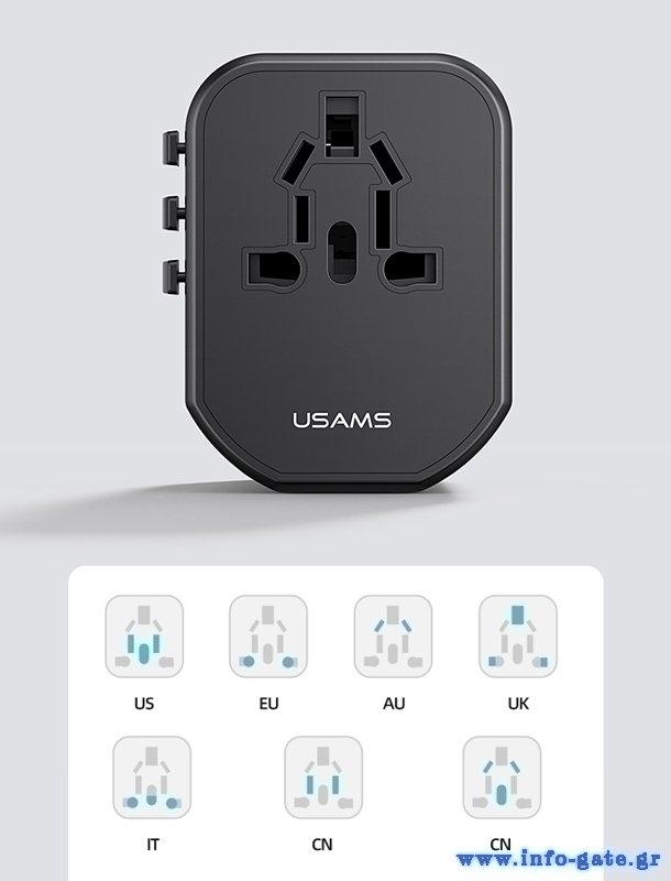 Φορτιστής & αντάπτορας πρίζας από την Usams, κατάλληλος για χρήση με τύπους πριζών US, AU, EU και UK. Η εναλλαγή της πρίζας γίνεται εύκολα με συρόμενο κουμπί και διαθέτει διπλή ασφάλεια. Εξοπλίζεται με 1x USB-C και 2x USB θύρες εξόδου, για την φόρτιση συσκευών, με μέγιστη απόδοση 20W.