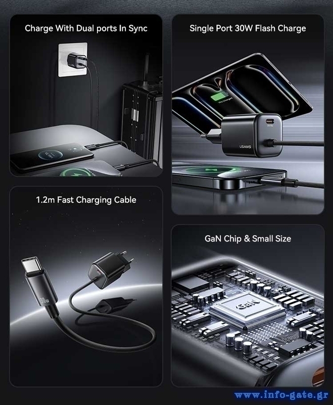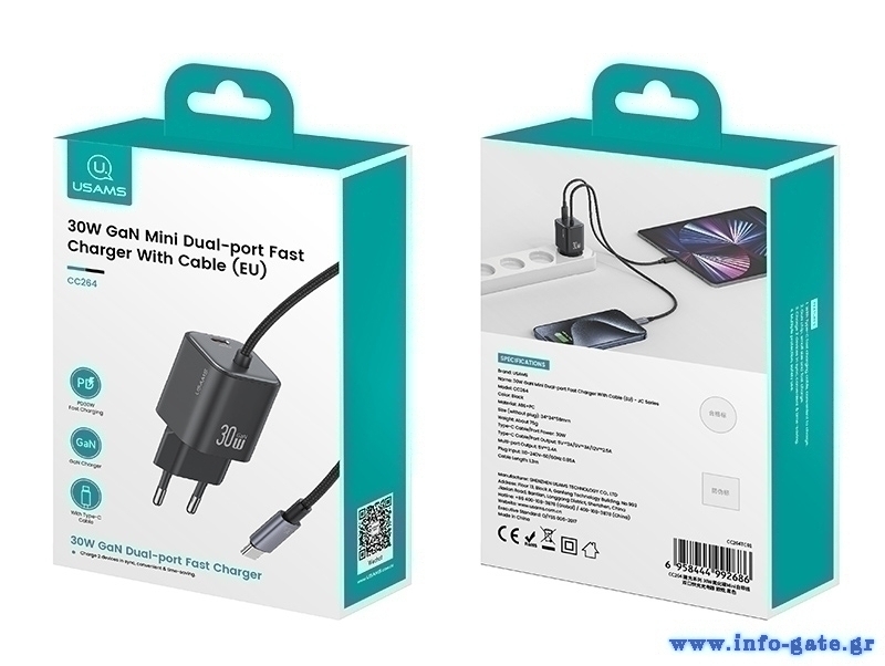 USAMS φορτιστής τοίχου CC264 με καλώδιο, USB-C, 30W, GaN, μαύρος