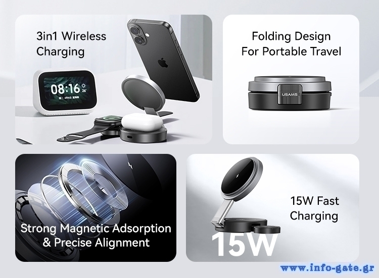 USAMS ασύρματος φορτιστής CD234, 3 σε 1, 15W, μαύρος