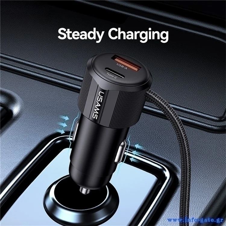 USAMS φορτιστής αυτοκινήτου CC287 με 2 σε 1 καλώδιο, USB/USB-C θύρες, 66W, μαύρος