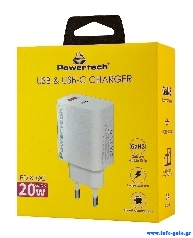 POWERTECH φορτιστής τοίχου PT-1437, USB/USB-C, 20W, GaN, λευκός