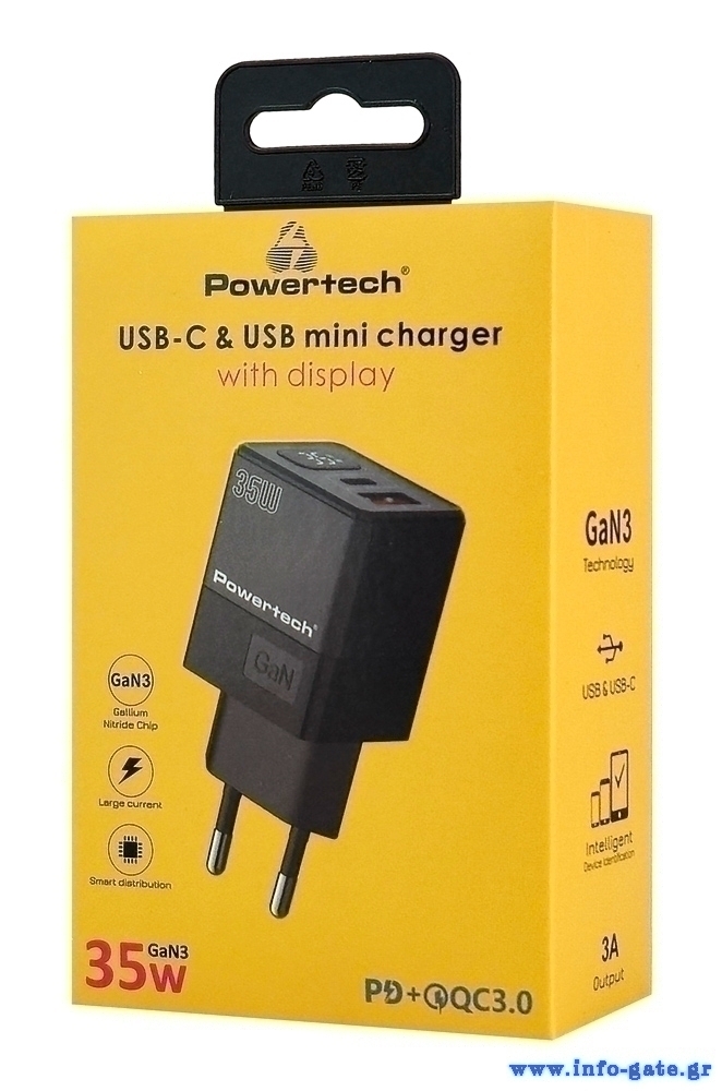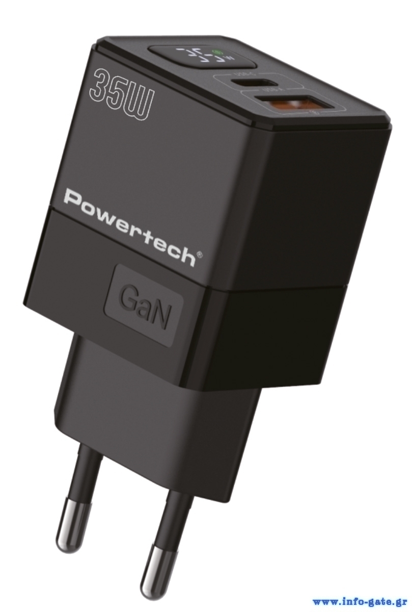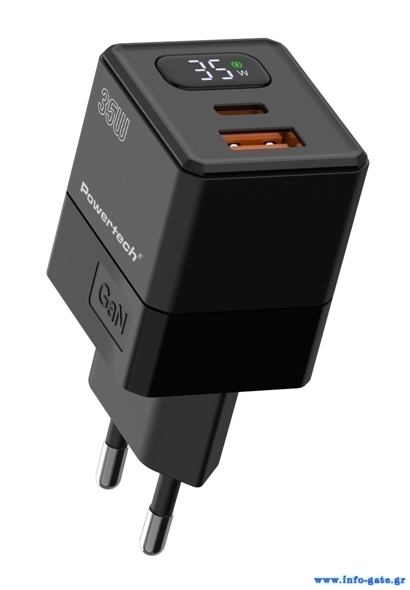 POWERTECH φορτιστής τοίχου PT-1499 με οθόνη, USB/USB-C, 35W, GaN, μαύρος