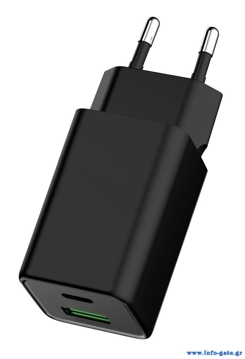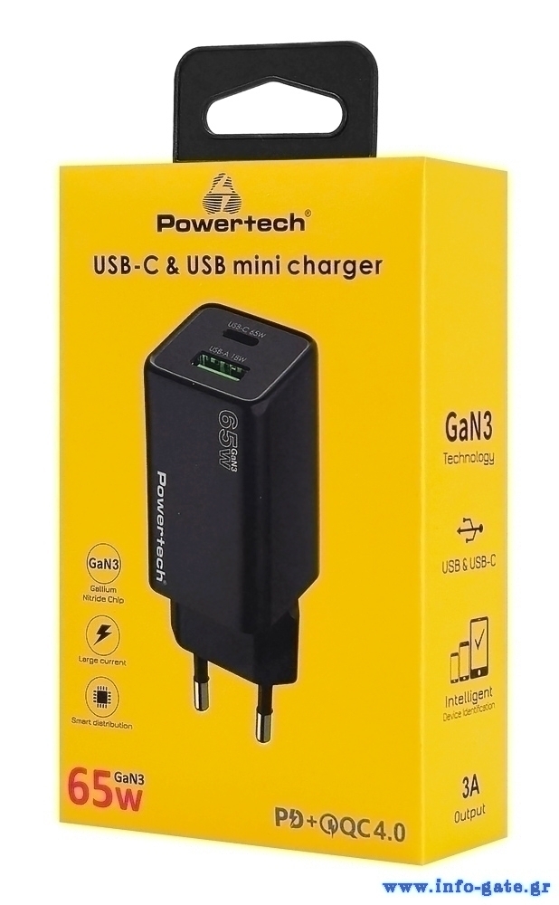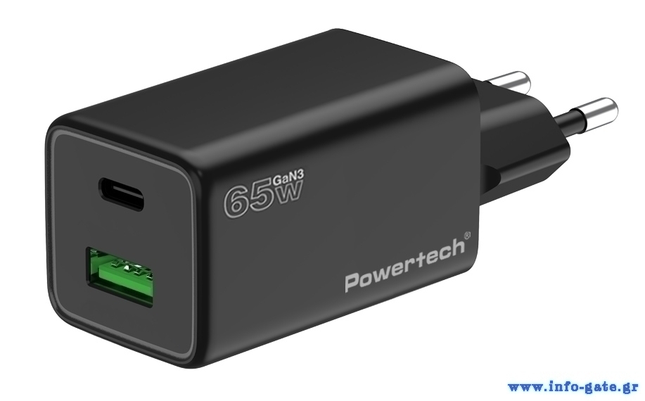 Υψηλής απόδοσης φορτιστής τοίχου της Powertech, κατασκευασμένος από ανθεκτικό υλικό και συμβατός με συσκευές που φορτίζουν μέσω θύρας USB. Διαθέτει USB και USB-C θύρες εξόδου που υποστηρίζουν φόρτιση με μέγιστη απόδοση 65W.