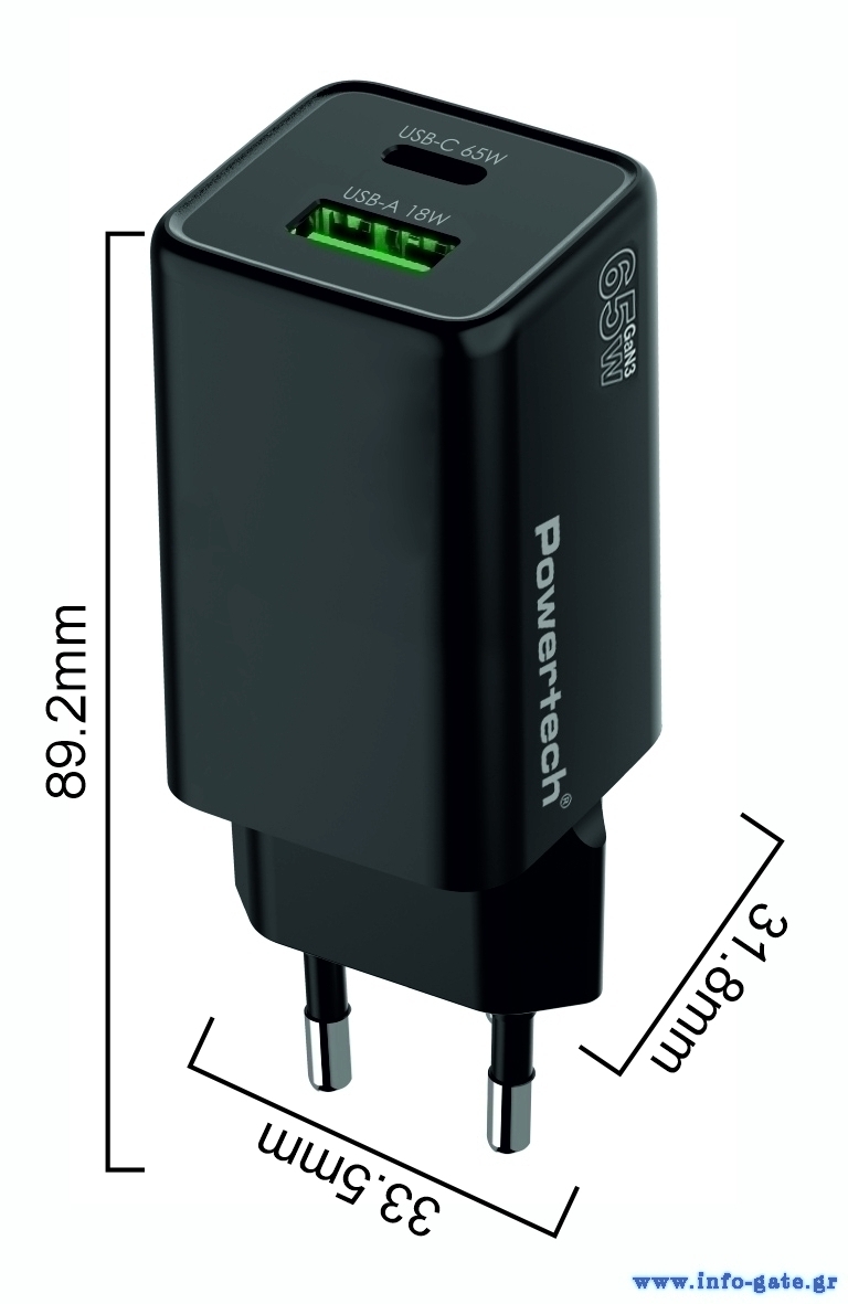 POWERTECH φορτιστής τοίχου PT-1501, USB/USB-C, 65W, GaN, μαύρος