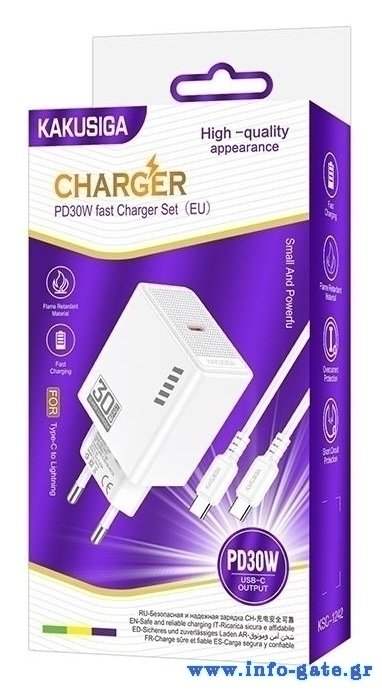 KAKUSIGA φορτιστής τοίχου KSC-1242 με καλώδιο USB-C, USB-C, 30W, λευκός