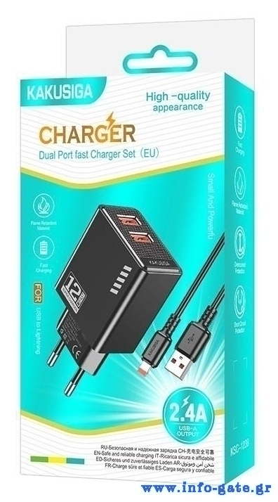 KAKUSIGA φορτιστής τοίχου KSC-1238 με καλώδιο Lightning, 2x USB, 12W, μαύρος