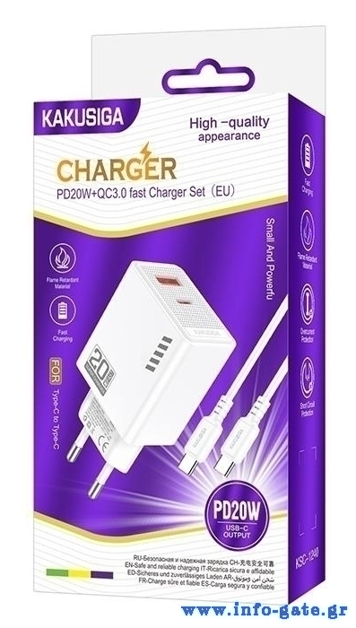 KAKUSIGA φορτιστής τοίχου KSC-1240 με καλώδιο USB-C, USB & USB-C, 20W, λευκός