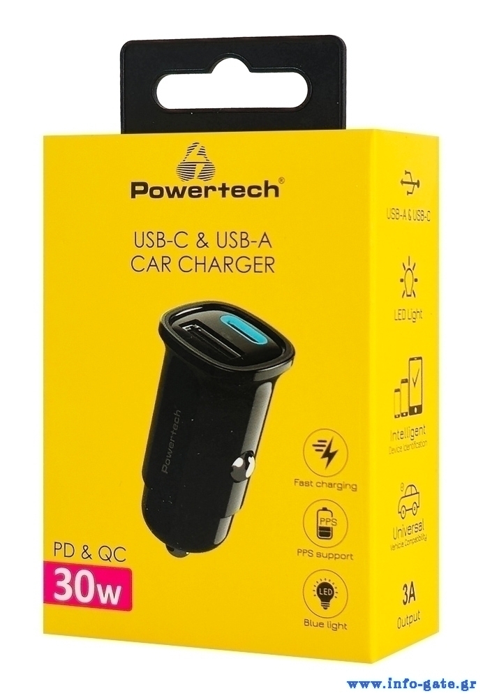 Υψηλής απόδοσης φορτιστής αυτοκινήτου της Powertech, συμβατός με συσκευές που φορτίζουν μέσω θύρας USB. Διαθέτει USB και USB-C θύρες εξόδου που υποστηρίζουν φόρτιση με μέγιστη συνολική απόδοση 30W.