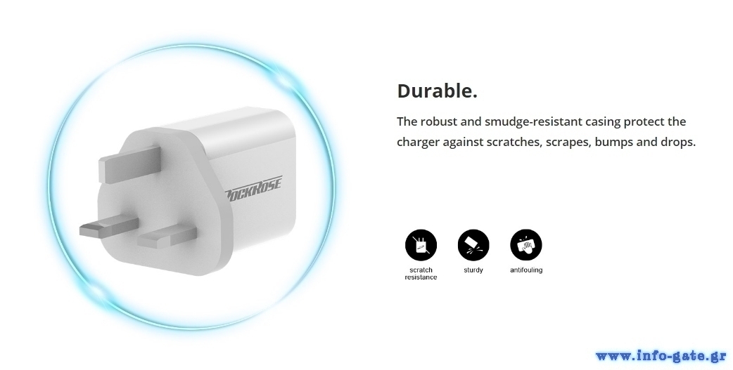Υψηλής απόδοσης USB φορτιστής για πρίζες τοίχου τύπου UK της ROCKROSE, κατασκευασμένος από ανθεκτικό υλικό και συμβατός με όλες τις συσκευές που φορτίζουν μέσω USB θύρας. Έχει κομψό design και υποστηρίζει fast charging λειτουργία. Διαθέτει 2 USB θύρες εξόδου, με μέγιστη απόδοση 2.4A. Διαθέτει κυκλώματα προστασίας από υπερβολική τάση, υπερφόρτιση, υπερθέρμανση, βραχυκύκλωμα.