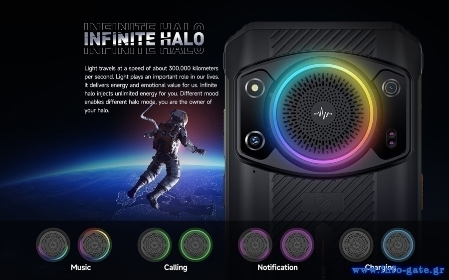 Ενσωματώνει μεγάλο ηχείο διαμέτρου 36mm που προσφέρει δυνατό και καθαρό ήχο για να ακούτε την αγαπημένη σας μουσική όπου και αν βρίσκεστε. Διαθέτει ring light Infinite Halo περιμετρικά του ηχείου, εξοπλισμένο με 18 RGB LED και διαφορετικά modes φωτισμού ανάλογα με τις λειτουργίες του smartphone.