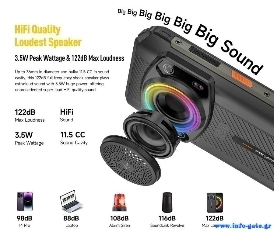 Ηχείο: 122dB HiFi Quality Loudest Speaker, 3.5W peak wattage, Smart PA high volume boost, 36 mm speaker diameter, 11.5cc-equivalent large sound cavity design