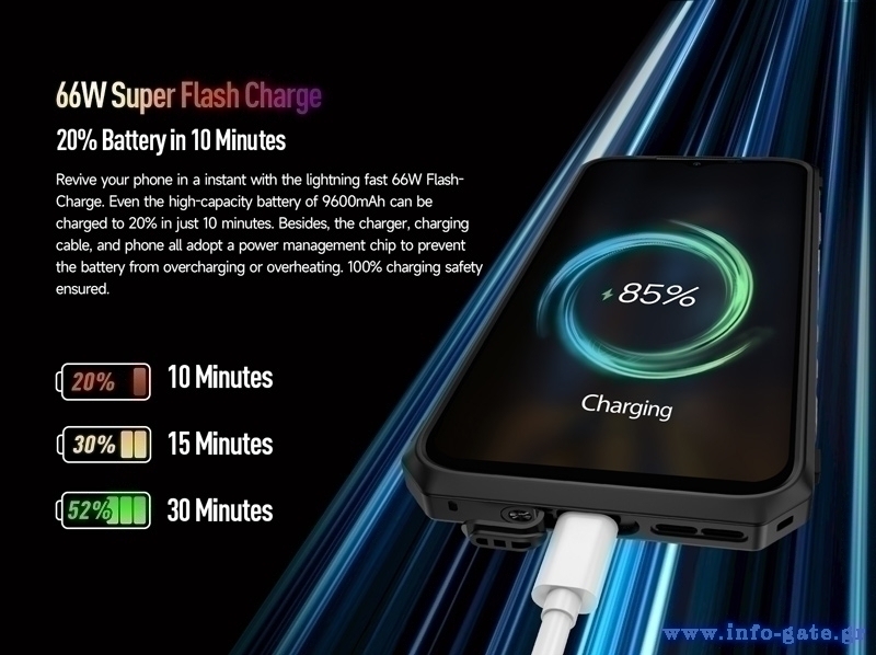 Η μπαταρία των 9600mAh προσφέρει μεγάλη αυτονομία, ενώ υποστηρίζει ταχεία φόρτιση με απόδοση 66W και ασύρματη φόρτιση με απόδοση 15W. Επιπλέον, υποστηρίζει λειτουργία αντίστροφης φόρτισης, που σας επιτρέπει την ασύρματη φόρτιση άλλων συσκευών, όπως earbuds και smartphone.