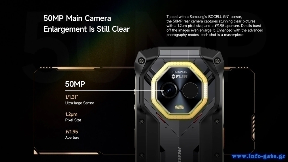 Με 50MP κύρια κάμερα και εμπρόσθια κάμερα 32MP, μπορείτε να τραβήξετε εικόνες υψηλής ανάλυσης, με εξαιρετική σαφήνεια και ζωντανά φυσικά χρώματα ενώ υποστηρίζει και υποβρύχια λήψη φωτογραφιών και βίντεο. Επιπλέον, ενσωματώνει αισθητήρα θερμικής εικόνας FLIR που σας επιτρέπει να ανιχνεύετε με θερμική εικόνα, θερμοκρασίες από -10 °C έως 450 °C.