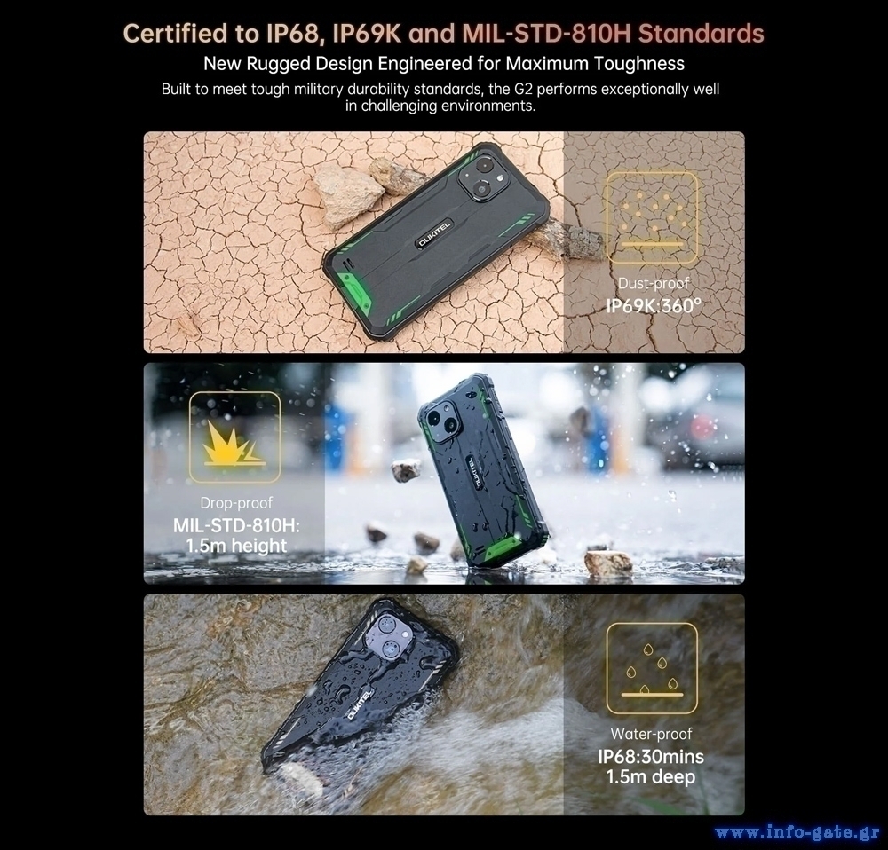Με πιστοποίηση IP68/IP69K και πρότυπο MIL-STD-810H, το G2 είναι σχεδιασμένο για να αντέχει σε ακραίες συνθήκες χρήσης και περιβάλλοντα.