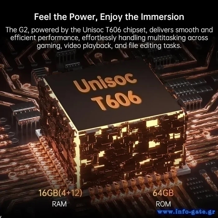 Εξοπλίζεται με μεγάλη οθόνη 6", οκταπύρηνο επεξεργαστή, 4GB (+12GB virtual) μνήμη RAM και 64GB αποθηκευτικό χώρο, με δυνατότητα επέκτασης έως 1TB με κάρτα μνήμης micro SD (δεν συμπεριλαμβάνεται).