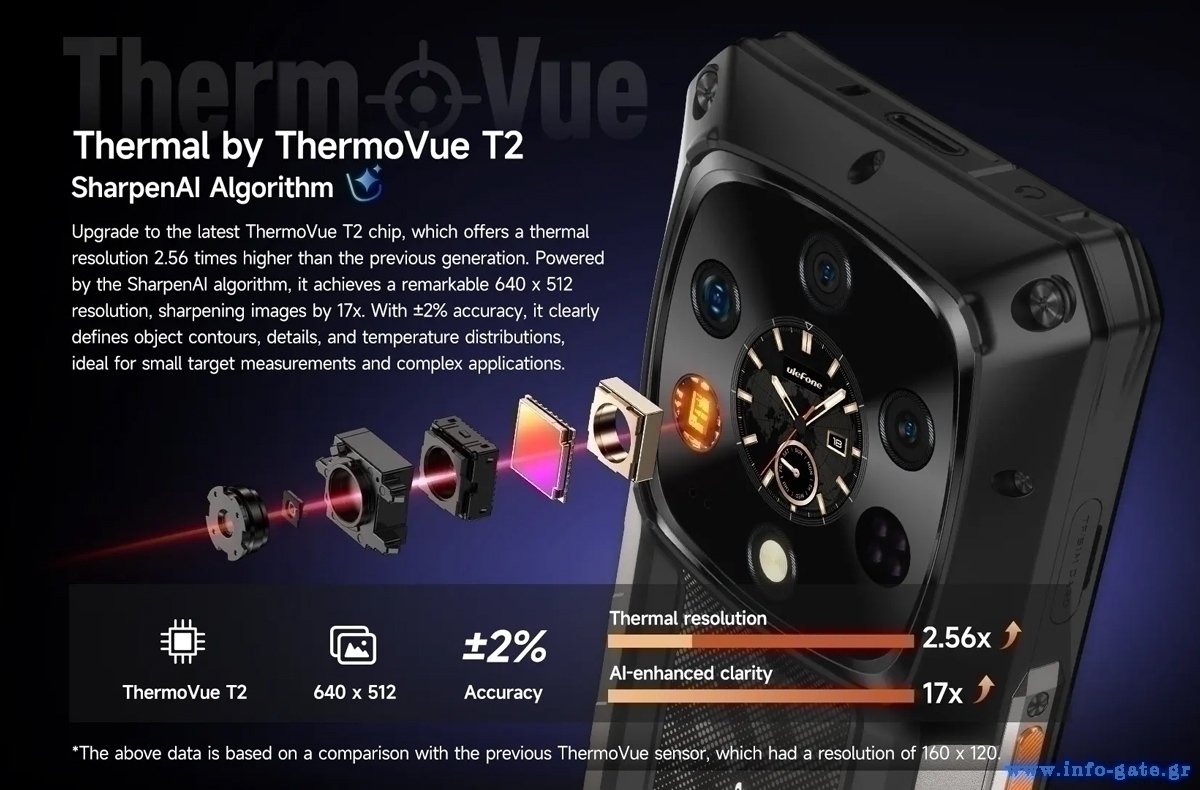 Το Armor 28 Ultra Thermal ενσωματώνει αισθητήρα θερμικής εικόνας ThermoVue T2 που σας επιτρέπει να ανιχνεύετε με θερμική εικόνα, θερμοκρασίες από -20 °C έως 550 °C.