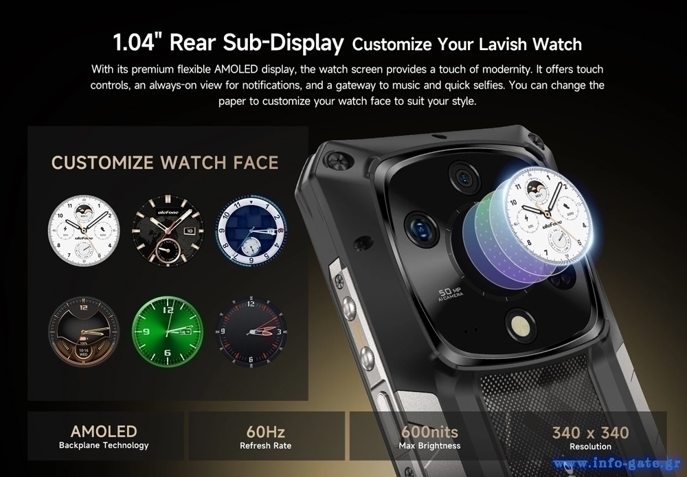 -Πίσω οθόνη: 1.04" AMOLED, 340x340, 600 nits, 60 Hz, Corning Gorilla Glass Victus