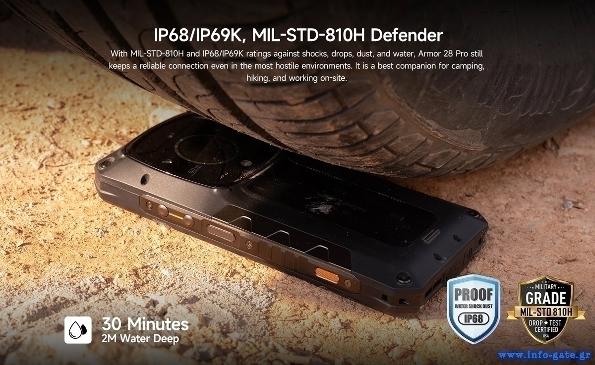 Με πιστοποίηση IP68/IP69K και πρότυπο MIL-STD-810H, το Armor 28 Pro είναι σχεδιασμένο για να αντέχει σε ακραίες συνθήκες χρήσης και περιβάλλοντα.