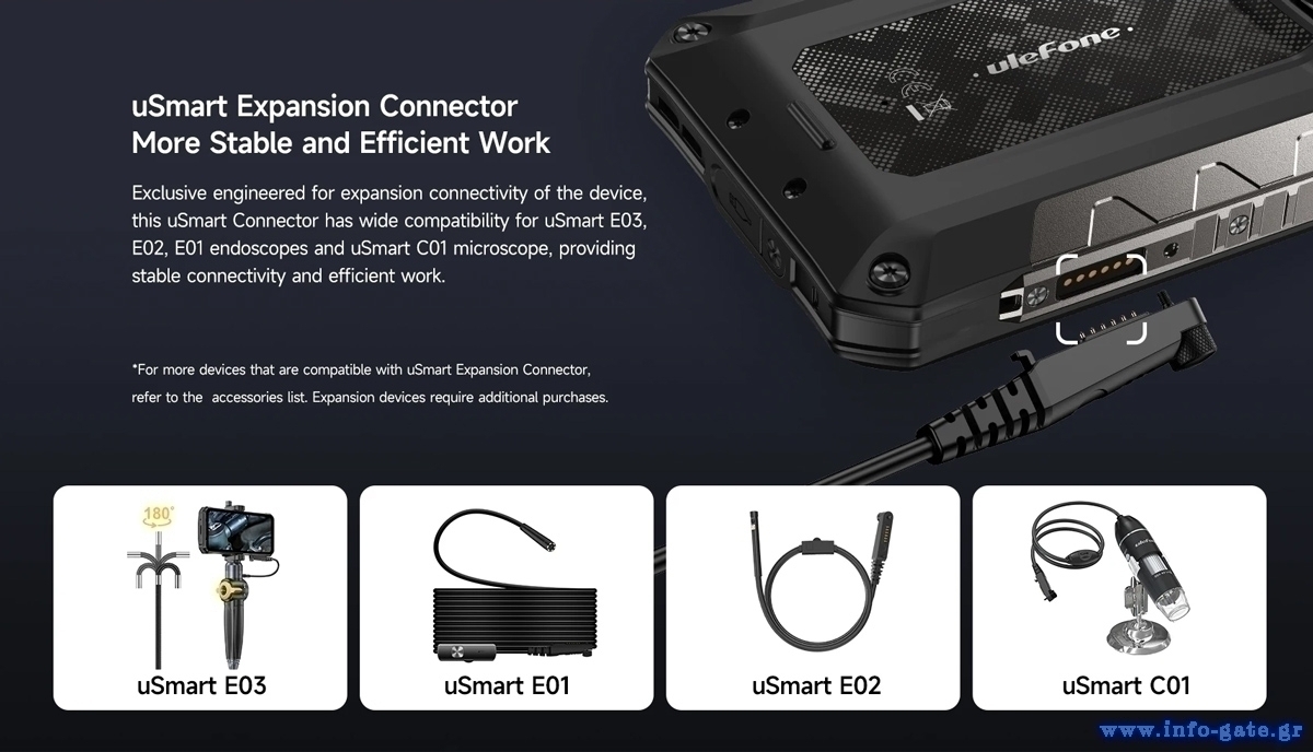 Η συμβατότητα του με uSmart αξεσουάρ (π.χ. ενδοσκοπικές κάμερες) της Ulefone, σας δίνει την δυνατότητα να επεκτείνετε τις λειτουργίες του smartphone.