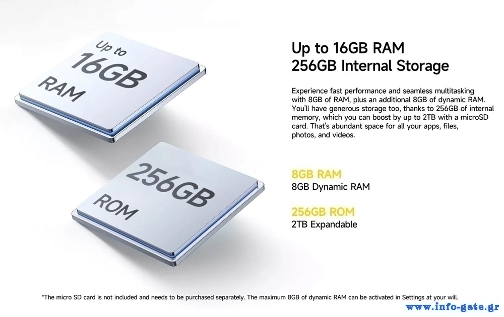 Με 8GB (+8GB virtual) RAM και 256GB ROM για να αποθηκεύετε τα αγαπημένα σας αρχεία, φωτογραφίες και βίντεο. Επιπλέον, προσφέρει την δυνατότητα να επεκτείνετε τον χώρο αποθήκευσης του smartphone με κάρτα micro SD έως 2TB.