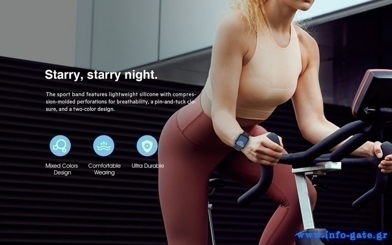 Ποιοτικό λουράκι σιλικόνης Starry Night για Apple Watch της Rockrose, κατασκευασμένο από ανθεκτικό υλικό, ιδανικό για αθλητικές δραστηριότητες. Διαθέτει εύκολο κούμπωμα τύπου pin and tuck ενώ παράλληλα προσφέρει άνεση, κομψότητα και αντοχή στην χρήση.