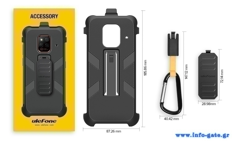 Η θήκη προστασίας της Ulefone για το smartphone Power Armor 14 είναι κατασκευασμένες από αντιολισθητικό και ανθεκτικό υλικό στις πτώσεις, που δεν χαράσσεται και δεν κάνει δαχτυλιές. Μαζί με την θήκη συμπεριλαμβάνονται, ένα περιστρεφόμενο κλιπ 180° που μπορεί να τοποθετηθεί σε ζώνη και ένα κλιπ με γάντζο που μπορεί να κρεμαστεί σε ζώνη ή σακίδιο.