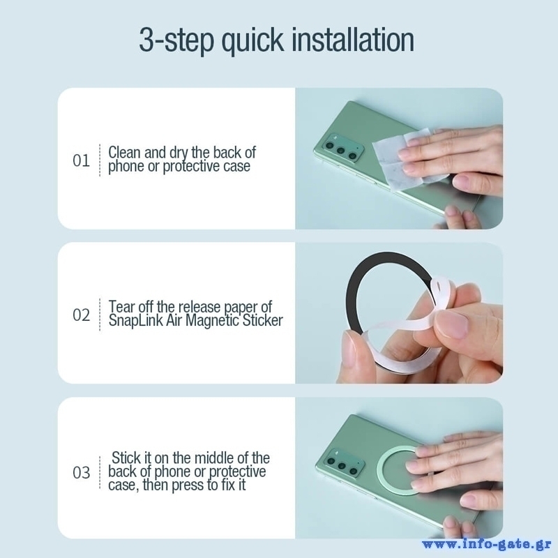 Το μαγνητικό ring SnapLink Air της Nillkin σας επιτρέπει να μετατρέψετε οποιοδήποτε smartphone σε μαγνητικό. Επικολλάται στην επιφάνεια του smartphone ή της θήκης με ισχυρό αυτοκόλλητο 3M, επιτρέποντας σας να το τοποθετείτε σε μαγνητικές βάσεις.