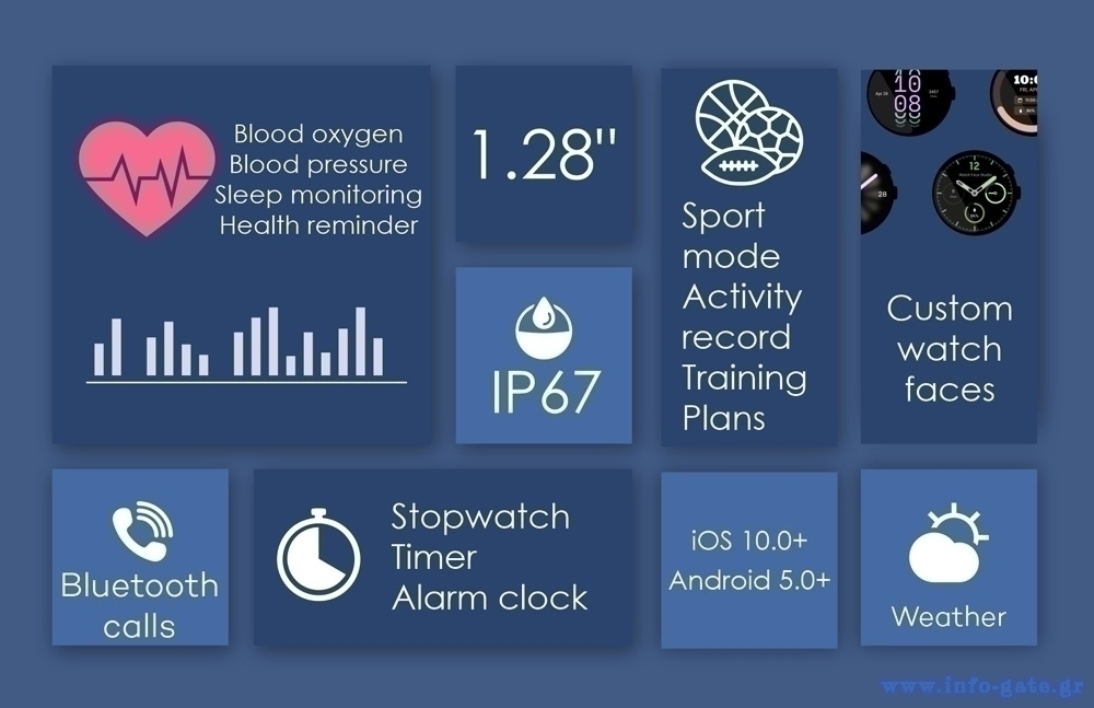 Εξοπλίζεται με εντυπωσιακή έγχρωμη οθόνη αφής 1.28" και υποστηρίζει πραγματοποίηση και απάντηση κλήσεων απευθείας από το smartwatch.