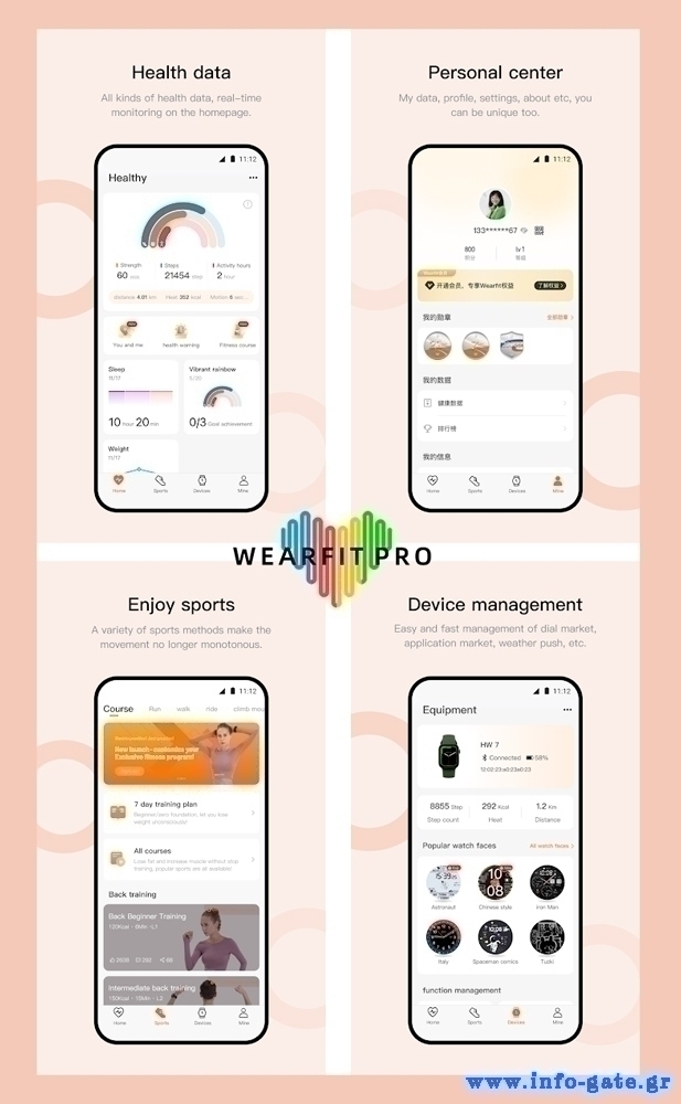 Συνδέεται μέσω Bluetooth και της εφαρμογής Wearfit Pro με το smartphone σου για να λαμβάνεις ειδοποιήσεις μηνυμάτων, κλήσεων και εφαρμογών, να διαμοιράζεσαι την τοποθεσία και τις μετρήσεις σου με τα δικά σου άτομα, ενώ διαθέτει personal training video με ολοκληρωμένα προγράμματα ασκήσεων.