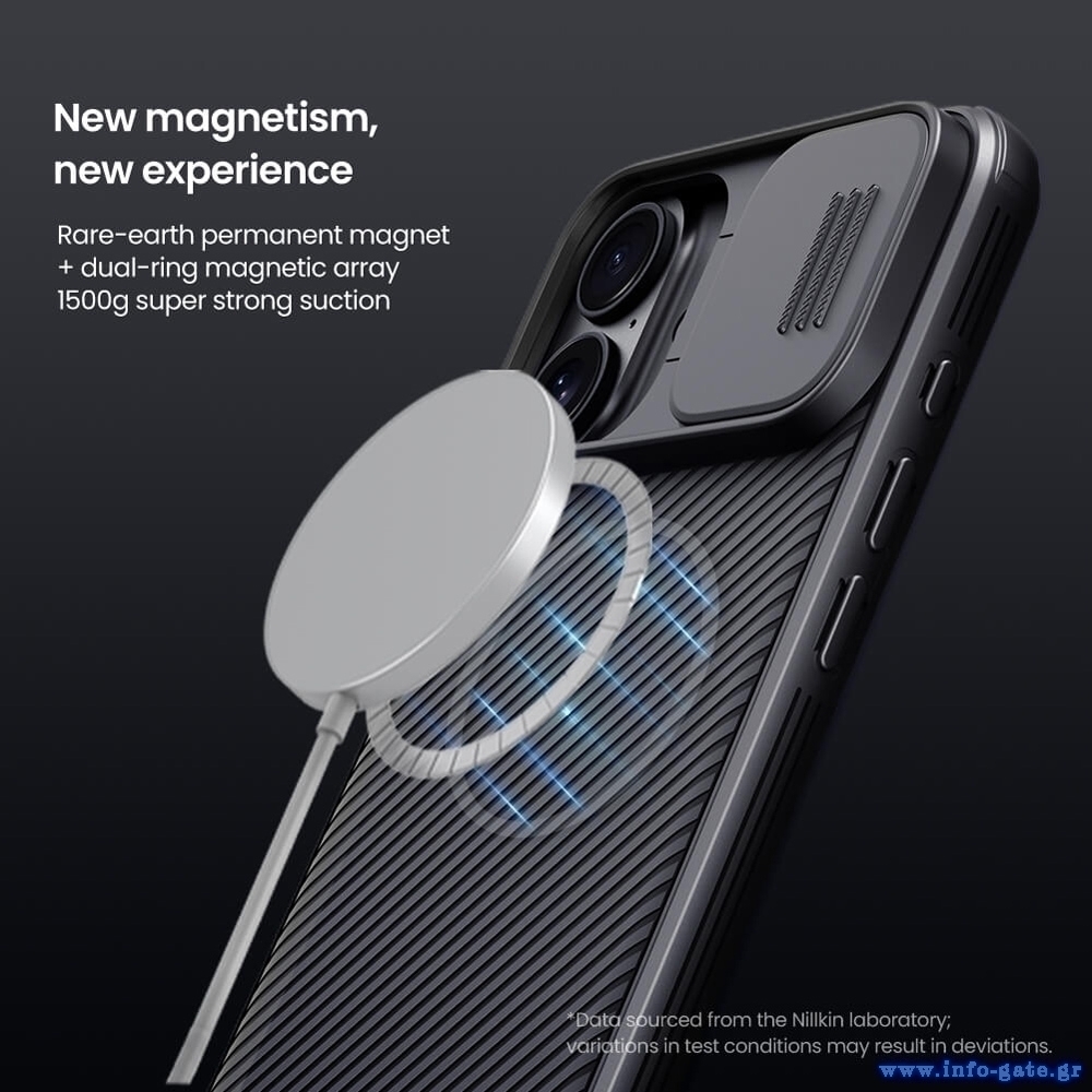 Η θήκη της σειράς CamShield Pro Magnetic της Nillkin χαρακτηρίζεται από την ενισχυμένη προστασία που προσφέρει, το σκληρό υλικό κατασκευής της με την ανάγλυφη επιφάνεια, αλλά και την έξτρα προστασία των καμερών και της ιδιωτικότητας σας, χάρη στο συρόμενο καπάκι της.
