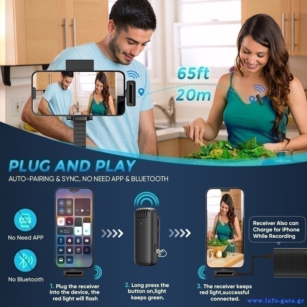 Συνδέεται με το smartphone ή tablet σας ασύρματα, μέσω του receiver και της θύρας Lightning. Η στερέωση του μικροφώνου γίνεται εύκολα στο ρούχο σας με κλιπ συγκράτησης.