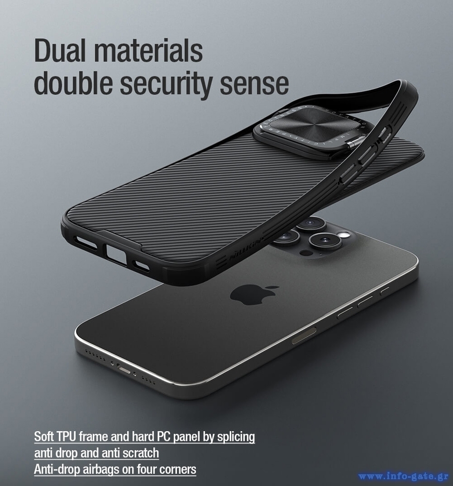 Η θήκη της σειράς CamShield Prop της Nillkin χαρακτηρίζεται από την ενισχυμένη προστασία που προσφέρει, το σκληρό υλικό κατασκευής της με την ανάγλυφη επιφάνεια, αλλά και την έξτρα προστασία των καμερών και της ιδιωτικότητας σας, χάρη στο ανοιγόμενο μεταλλικό καπάκι καμερών, το οποίο μπορεί να χρησιμοποιηθεί και ως stand.