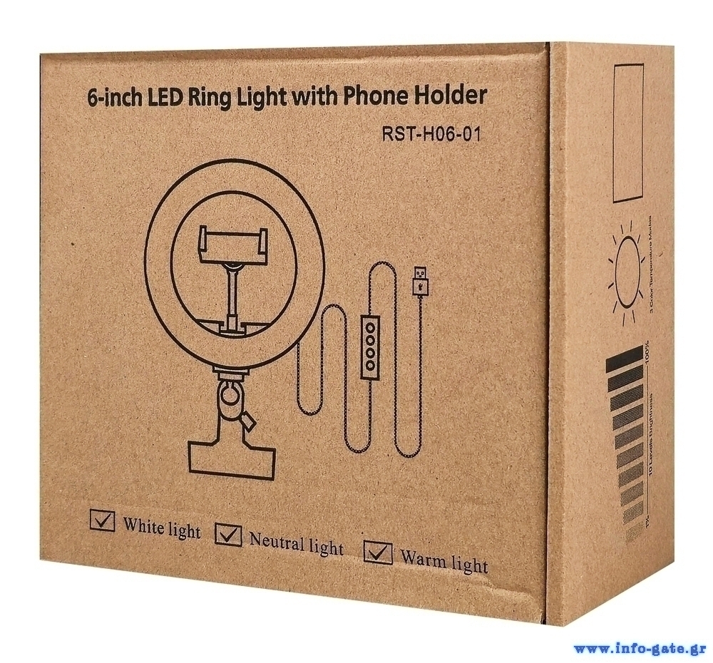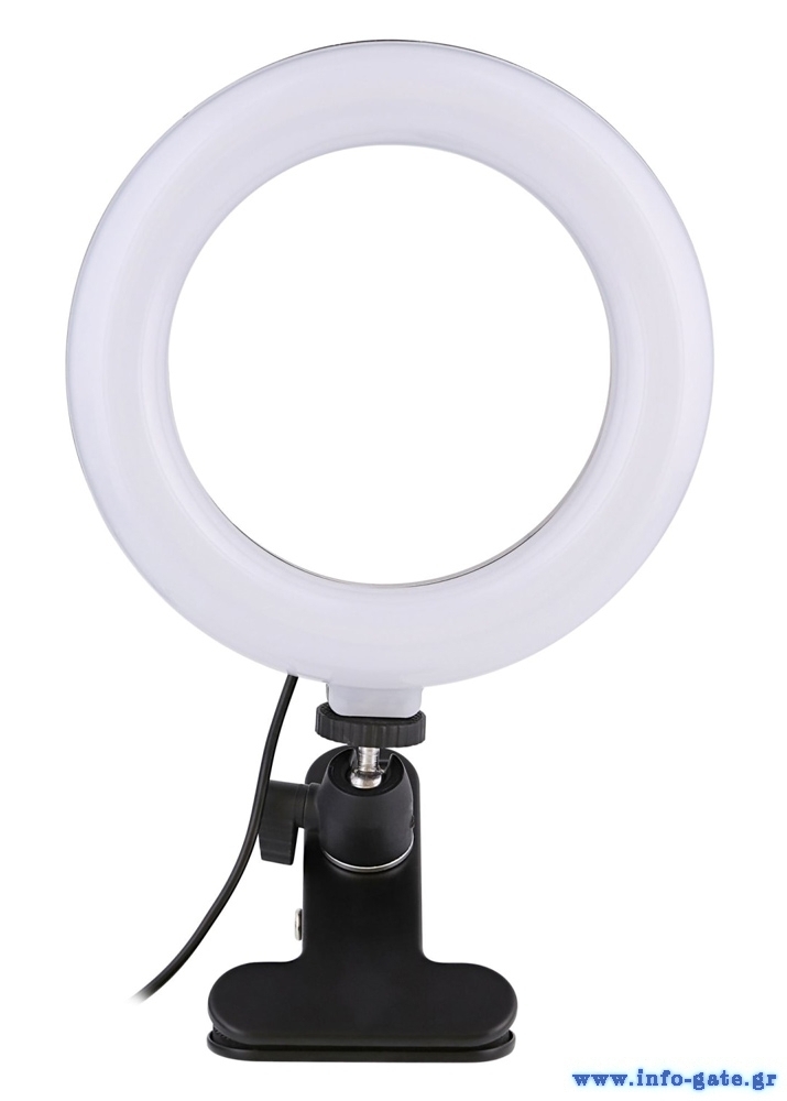 Φωτιστικό δαχτυλίδι LED με διάμετρο 16cm, ιδανικό για λήψη φωτογραφιών ή βίντεο, μακιγιάζ και live μεταδόσεις. Διαθέτει λαμπτήρα που προσφέρει τη δυνατότητα αλλαγής χρώματος λευκού φωτός αλλά και την μείωση/αύξηση της φωτεινότητας.