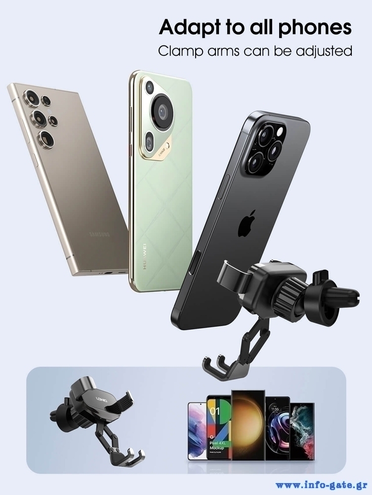 Βάση αυτοκινήτου για smartphone με στήριξη σε οριζόντιους ή κάθετους αεραγωγούς του αυτοκινήτου.