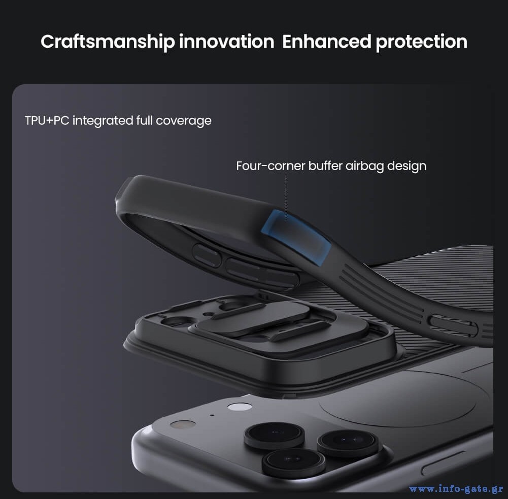 Η θήκη της σειράς CamShield Pro της Nillkin χαρακτηρίζεται από την ενισχυμένη προστασία που προσφέρει, το σκληρό υλικό κατασκευής της με την ανάγλυφη επιφάνεια, αλλά και την έξτρα προστασία των καμερών και της ιδιωτικότητας σας, χάρη στο συρόμενο καπάκι της.