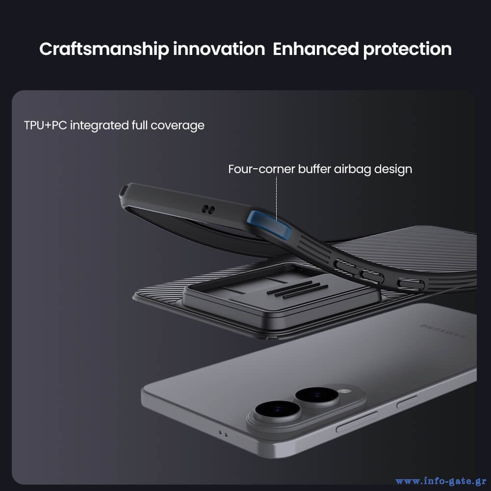 Η θήκη της σειράς CamShield Pro της Nillkin χαρακτηρίζεται από την ενισχυμένη προστασία που προσφέρει, το σκληρό υλικό κατασκευής της με την ανάγλυφη επιφάνεια, αλλά και την έξτρα προστασία των καμερών και της ιδιωτικότητας σας, χάρη στο συρόμενο καπάκι της.