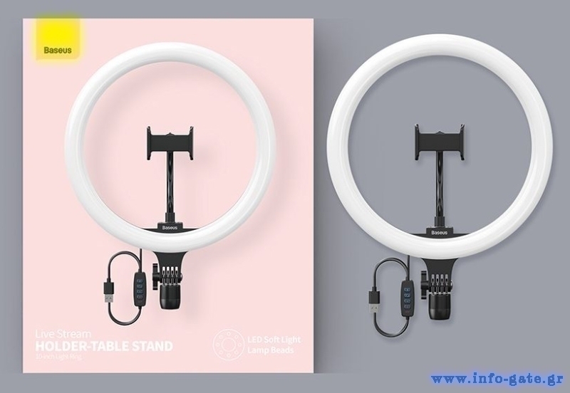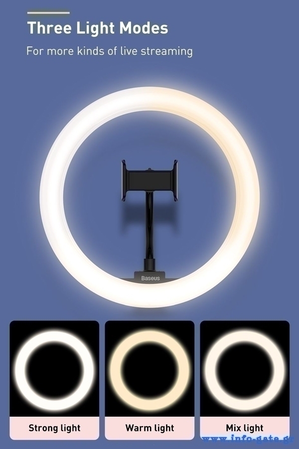 Φωτιστικό δαχτυλίδι, ιδανικό για λήψη φωτογραφιών ή βίντεο, μακιγιάζ και live μεταδόσεις. Διαθέτει 3 χρώματα φωτισμού, δαχτυλίδι LED 12” με ρυθμιζόμενη γωνία 180° και δυνατότητα μείωσης/αύξησης της φωτεινότητας. Εξοπλίζεται με χειριστήριο ενώ η τροφοδοσία του γίνεται μέσω καλωδίου USB.
