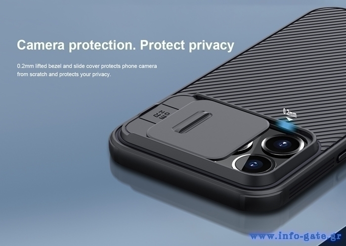 Η σειρά CamShield Pro της Nillkin χαρακτηρίζεται από την ενισχυμένη προστασία που προσφέρει το σκληρό υλικό κατασκευής της με την ανάγλυφη επιφάνεια αλλά και την έξτρα προστασία των καμερών και της ιδιωτικότητας σας, χάρη στο συρόμενο καπάκι της. Η επιφάνεια της είναι αντιολισθητική, έχει ενισχυμένα άκρα, δεν χαράσσεται και δεν κάνει δαχτυλιές.