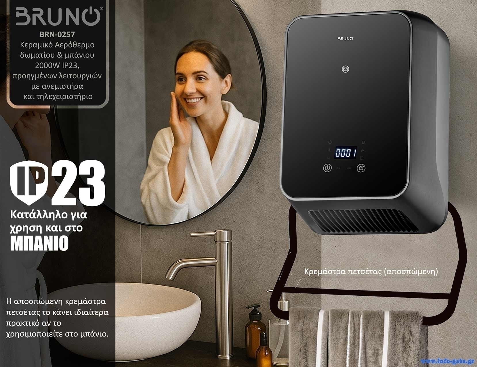 BRUNO κεραμικό αερόθερμο δωματίου & μπάνιου BRN-0257, 2000W, IP23, προηγμένων λειτουργιών, με ανεμιστήρα