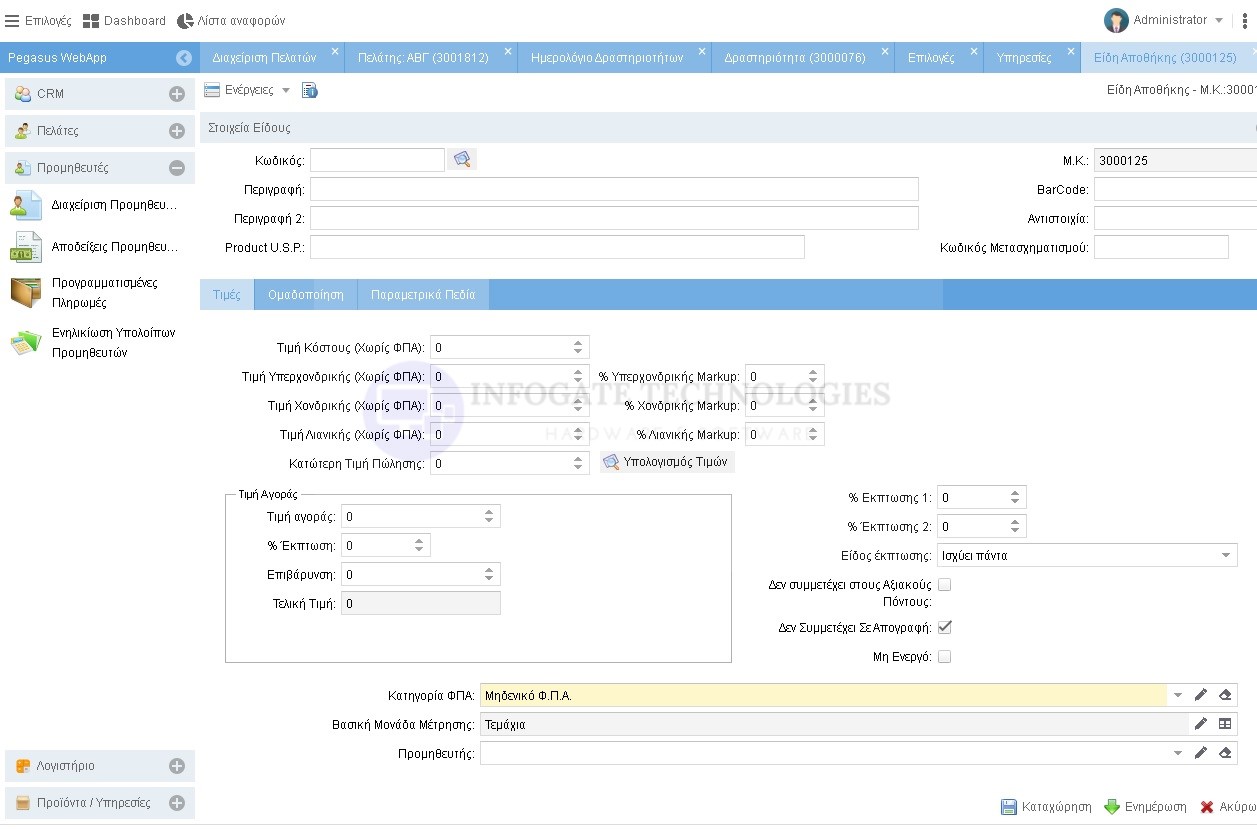Με αυτό το module μπορούμε να ορίζουμε επιπλέον τιμοκαταλόγους ανά είδος και ανά πελάτη. Ακόμα μας δίνει τη δυνατότητα να ορίσουμε ποσοτικές τιμές στα είδη μας.