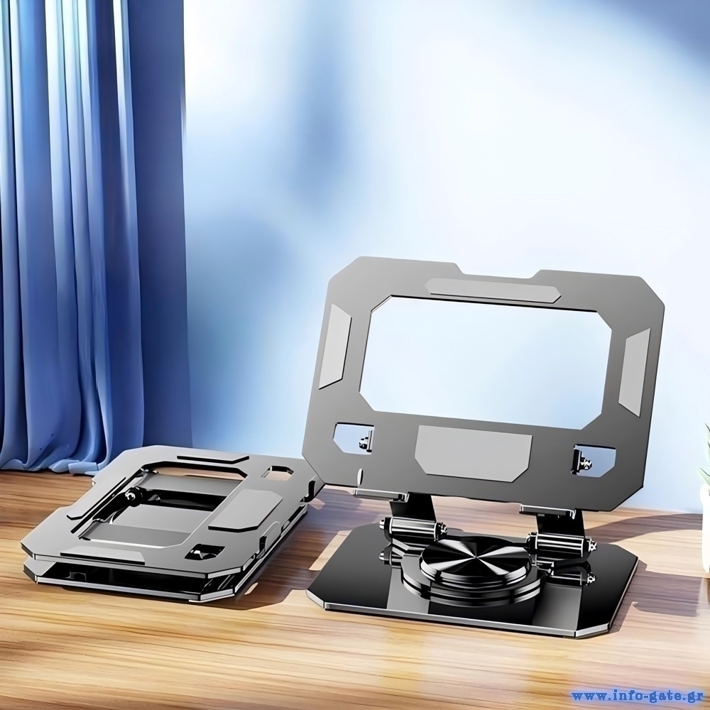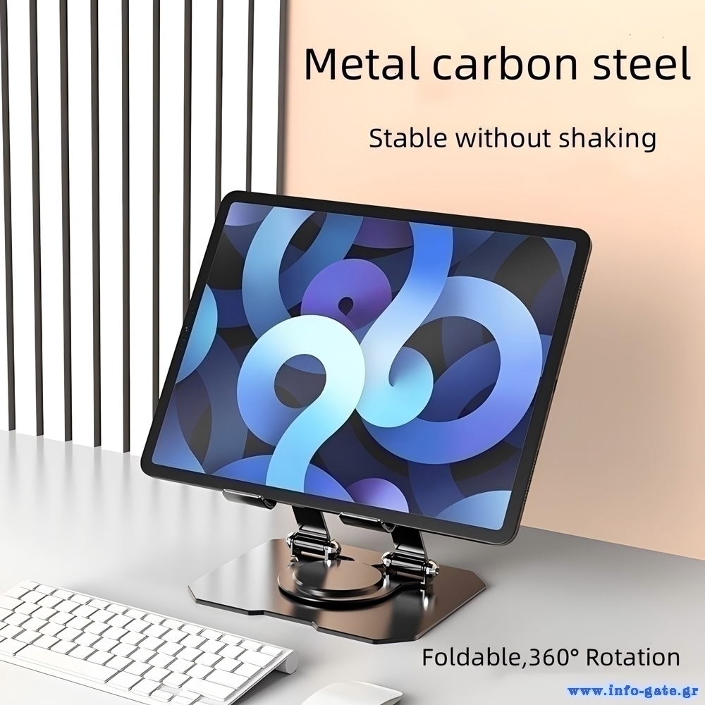Είναι μεταλλική, περιστρεφόμενη κατά 360° και ρυθμιζόμενη σε ύψος αλλά και κλίση. Είναι foldable και καταλαμβάνει μικρό όγκο όταν είναι κλειστή, για εύκολη μεταφορά σε τσάντα ή σακίδιο.