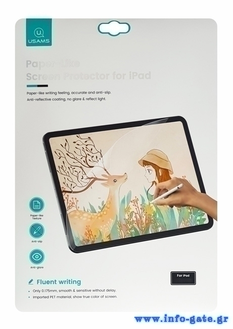 Screen protector από την Usams, για την προστασία της οθόνης της συσκευής σας από γρατζουνιές και γδαρσίματα. Έχει τέλεια εφαρμογή στην οθόνη, είναι εξαιρετικά διάφανο, με ματ φινίρισμα και υφή που δίνει την αίσθηση γραφής και σχεδίασης σε χαρτί. Δεν αφήνει φυσαλίδες κατά την εφαρμογή και διαθέτει μεγάλη ευαισθησία, για άμεση απόκριση κατά την αφή.