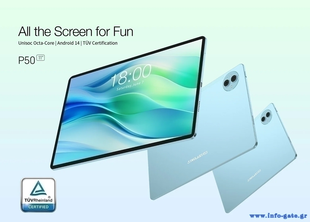 Το tablet P50 της Teclast συνδυάζει εντυπωσιακές επιδόσεις και εκλεπτυσμένο σχεδιασμό. Με μεγάλη οθόνη 11", ευέλικτο σύστημα λειτουργικού Android 14 και ισχυρό οκταπύρηνο επεξεργαστή, το P50 προσφέρει υψηλή απόδοση, για απρόσκοπτη περιήγηση στο διαδίκτυο, παιχνίδια, πολυμέσα και πολλά άλλα.