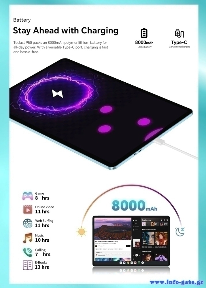 Η μπαταρία χωρητικότητας 8000mAh προσφέρει μεγάλη αυτονομία που θα σας απαλλάξει από τις συχνές αναζητήσεις τροφοδοσίας.