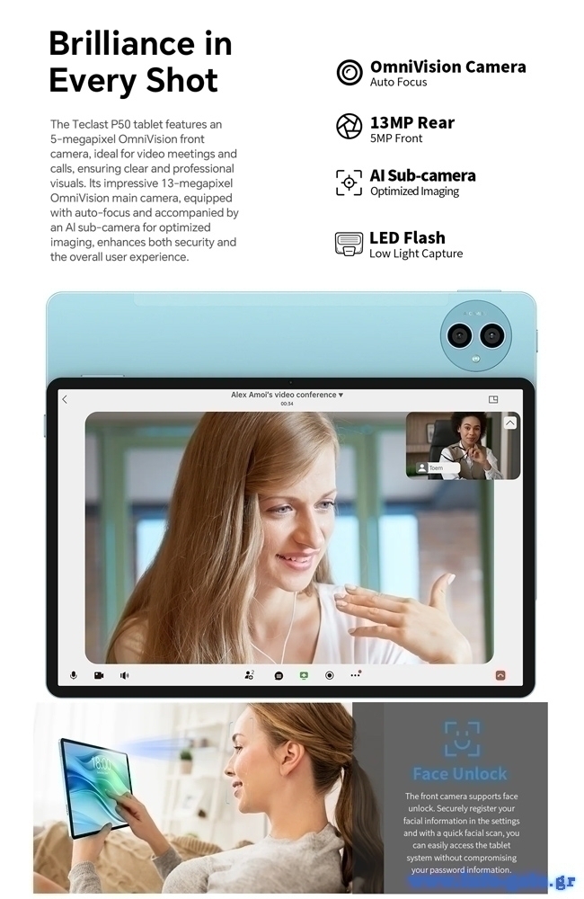 Εξοπλισμένο με επεξεργαστή 8 πυρήνων και λειτουργικό Android 14, το P50 προσφέρει υψηλή απόδοση για απρόσκοπτη περιήγηση στο διαδίκτυο, παιχνίδια, πολυμέσα και πολλά άλλα.