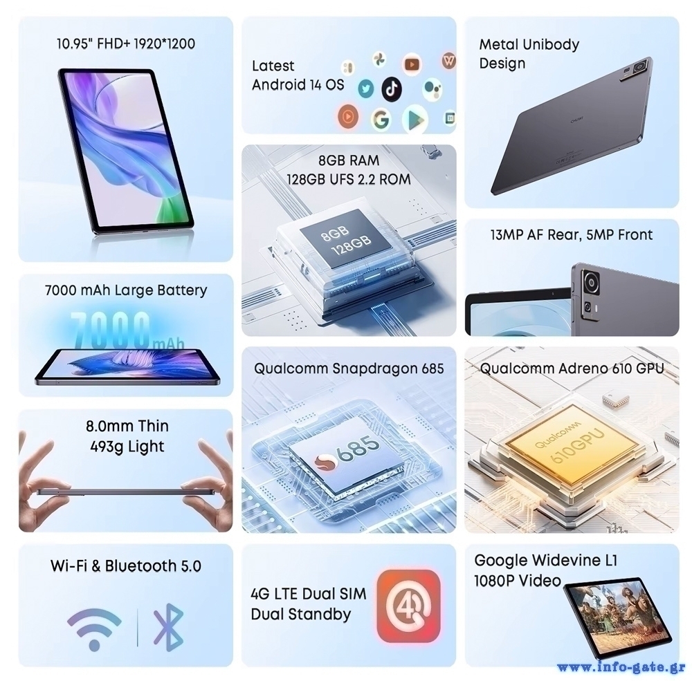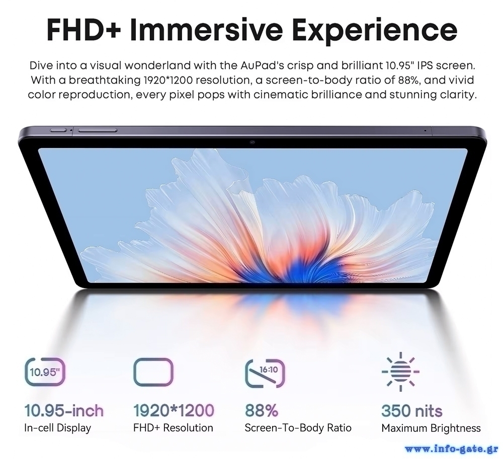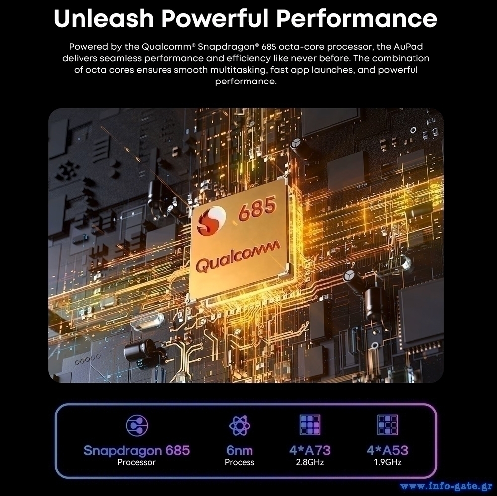 Εξοπλισμένο με επεξεργαστή 8 πυρήνων και λειτουργικό Android 14, το AuPad προσφέρει υψηλή απόδοση για απρόσκοπτη περιήγηση στο διαδίκτυο, παιχνίδια, πολυμέσα και πολλά άλλα.