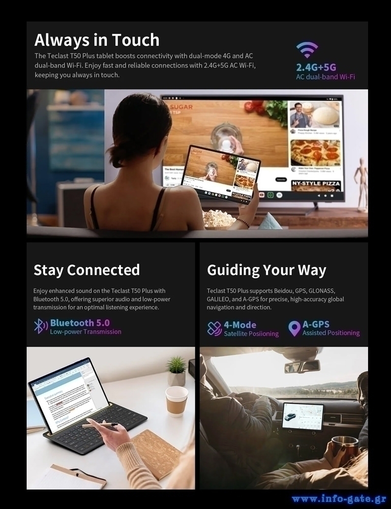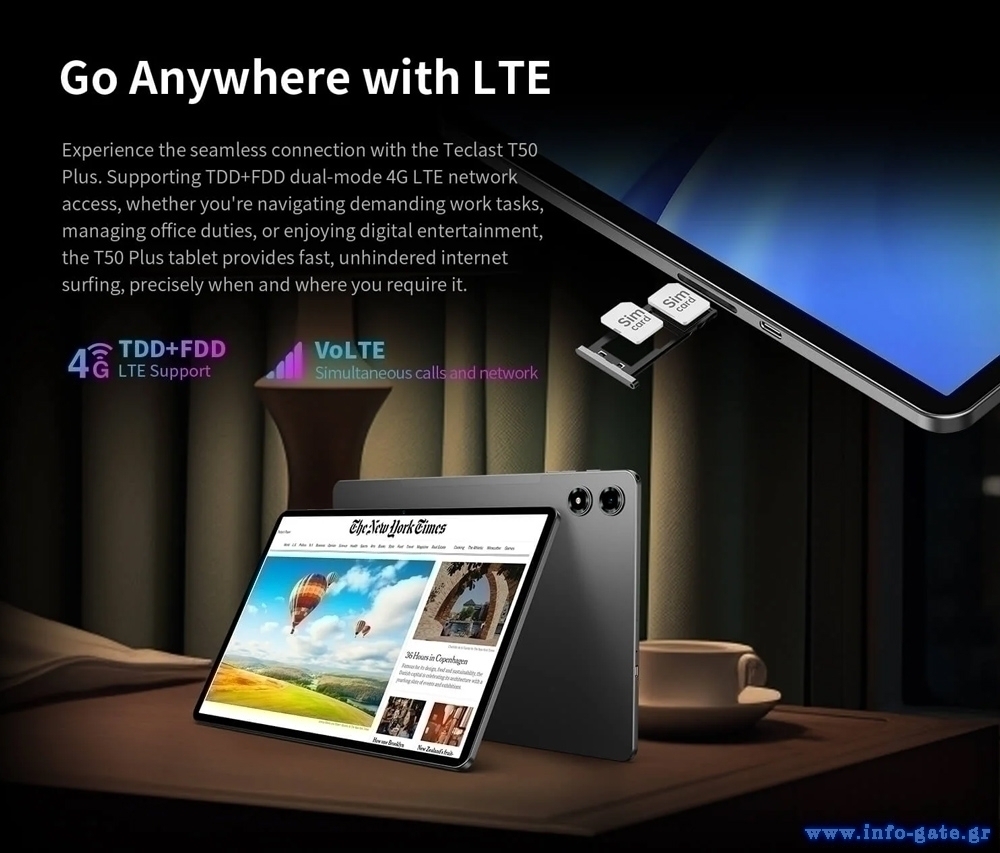 Με υποστήριξη διπλής κάρτα SIM και δικτύου 4G, το tablet T50 Plus σας επιτρέπει να παραμείνετε συνδεδεμένοι όπου κι αν βρίσκεστε. Επιπλέον, η τεχνολογία WiFi σας εξασφαλίζει γρήγορη και αξιόπιστη ασύρματη σύνδεση.